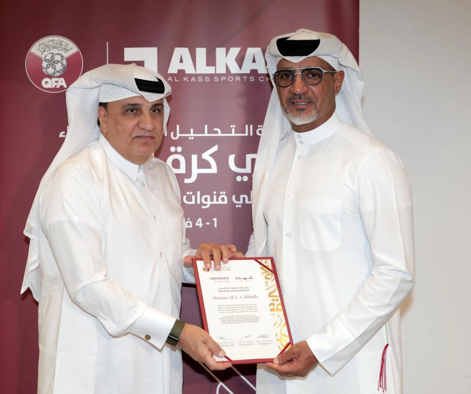 The course was held at the Development Department hall and featured participation from several former Qatari international players and analysts from Al Kass. Certificates were distributed to participants by Fahad Thani Al-Zaraa, Director of the Development Department at the QFA, who also delivered a number of lectures during the programme.